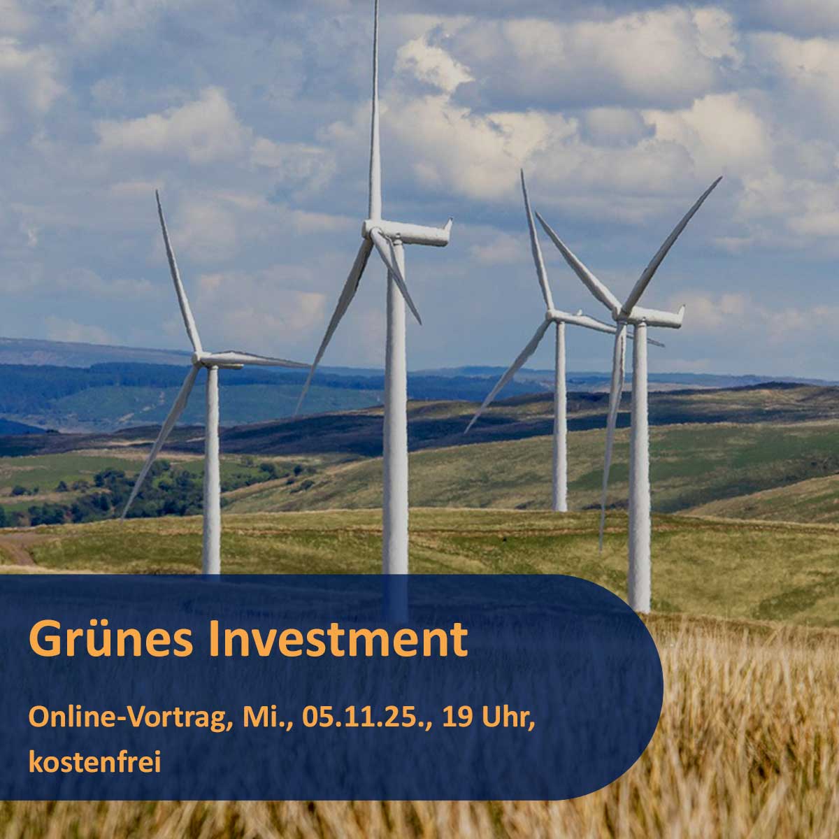Die Volkshochschule Nördlicher Breisgau lädt am Mittwoch, 5. November 2025, von 19:00 bis 20:30 Uhr zu einem kostenfreien Online-Vortrag zum Thema „Grünes Investment“ ein.