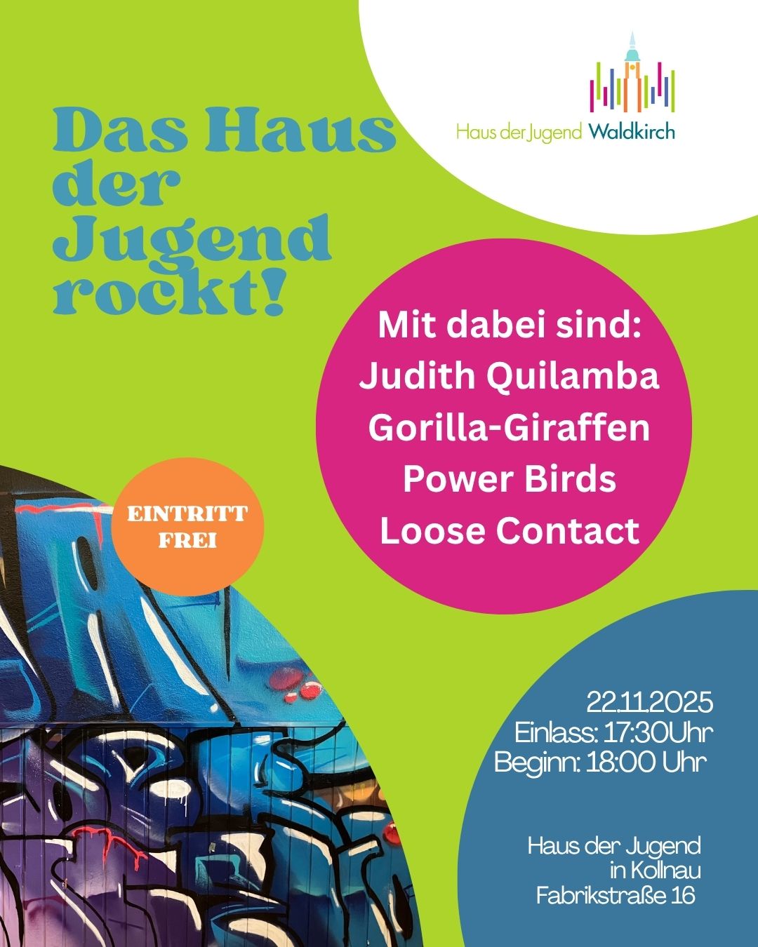 Das Haus der Jugend in Waldkirch-Kollnau lädt am Sonnabend, 22. November 2025, zu einem Konzertabend ein, der vollständig von Jugendlichen organisiert wird. Elf junge Menschen im Alter zwischen 13 und 17 Jahren haben Planung, Technik, Ablauf und Getränkeverkauf eigenständig übernommen.